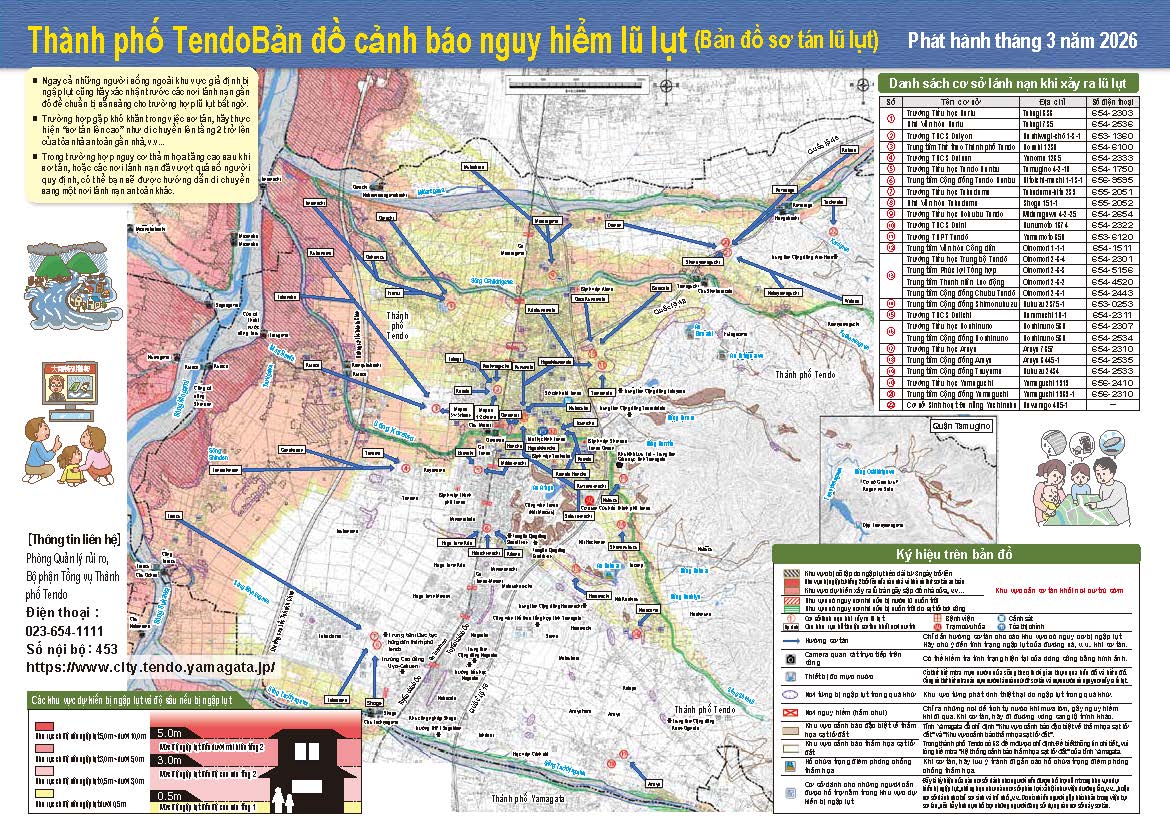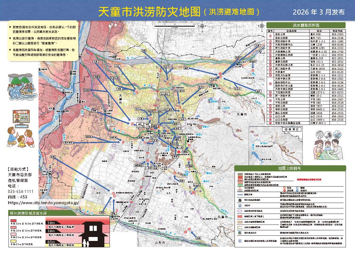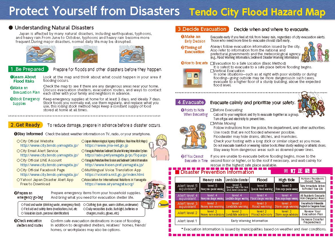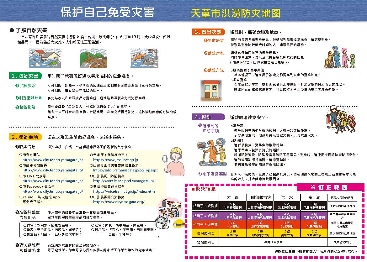山形県天童市の住民向け。「洪水ハザードマップ」の多言語翻訳と、レイアウト校正。